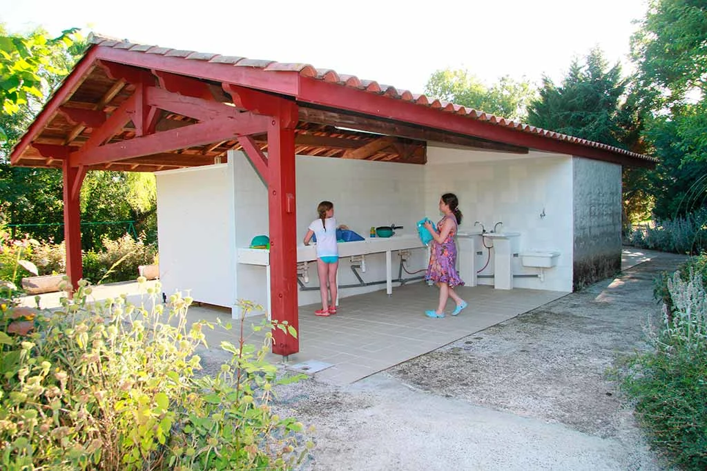 Le bâtiment sanitaire est équipé de plusieurs toilettes, d'une cabine pour des personnes à mobilité réduite avec une douche, une vasque et un WC.
