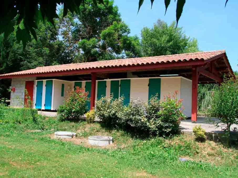 Le bâtiment sanitaire est équipé de plusieurs toilettes, d'une cabine pour des personnes à mobilité réduite avec une douche, une vasque et un WC.